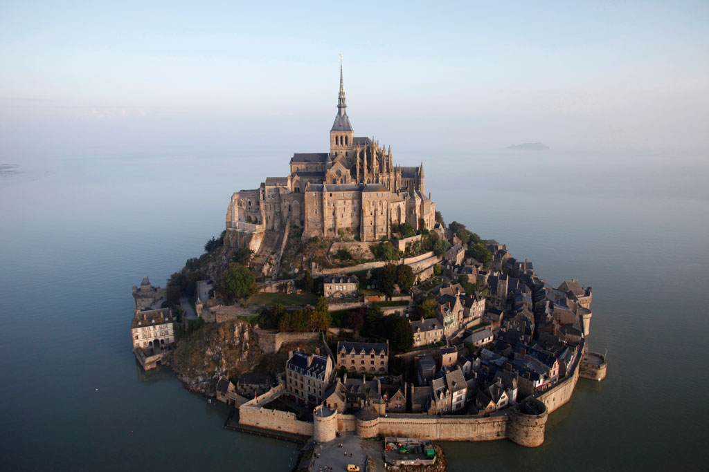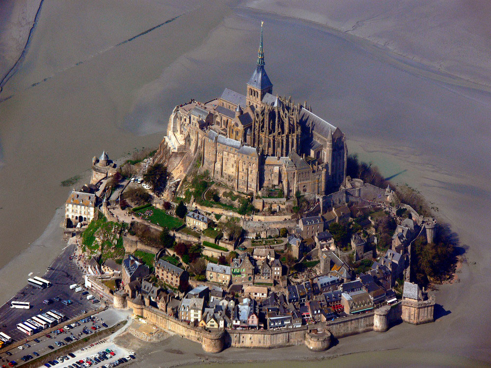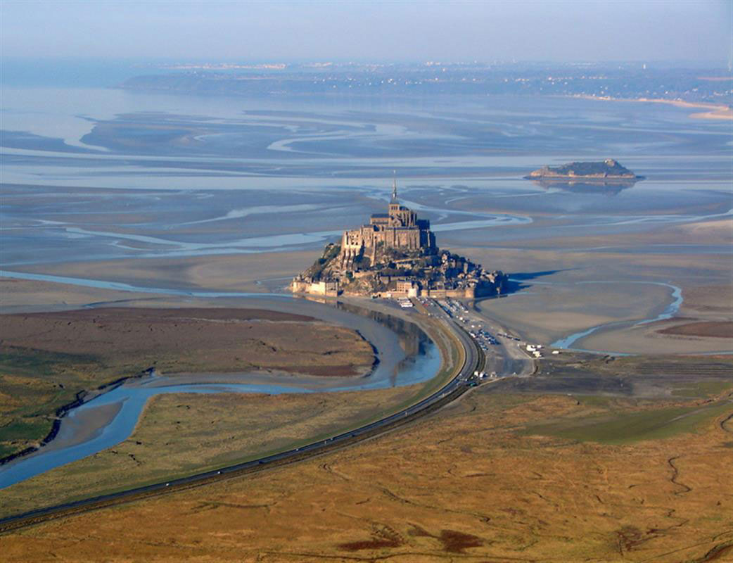 Când apa se retrage, lasă în jurul muntelui un deșert ud, un platou de nisip mustind de apă pe care oamenii îl invadeaza pentru a simți apa ieșind de sub fiecare pas, pentru a trăi senzația de a merge pe fundul oceanului. Este aici ceva din amintirea isprăvii de la Marea Roșie, a evreilor biblici urmăriți de trupele faraonului, iar la Saint-Michel totul este mitic. Mănăstirea îmbracă vârful muntelui de parcă ar fi izvorât din el și nimeni nu-și poate da seama unde începe lucrarea omului și unde se termină cea a naturii. Îmbinarea e perfectă, muntele urcă în inima mănăstirii, iar zidurile coboară pe versanți. Prima biserică a fost construită pe munte în anul 708 de către un episcop care a avut revelația de a o dedica Sfântului Mihail.