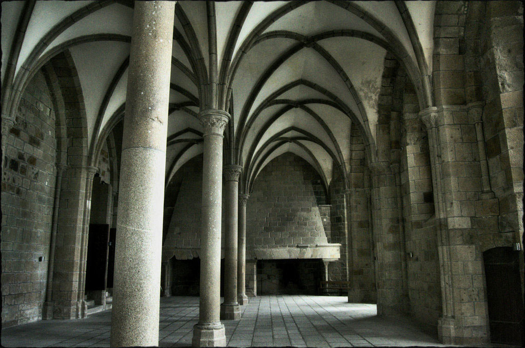 Sala oaspeților trimite, pe sub ogive din piatră sprijinite pe coloane suple, spre un cămin unde ardeau bușteni pe vremea când aici erau primiți vizitatorii de seamă. În Sala Cavalerilor ogivele sunt mai ample, stâlpii mai scurți și groși, iar tavanul mai jos, emanând masivitate. Aici se întâlneau cavalerii Ordinului Sfântul Mihail, înființat de Ludovic al XI-lea. Sala a servit mai mult ca scriptorium, atelier al celor ce copiau sau scriau cărțile Evului Mediu. Vârful ascuțit al bisericii, numit arhitectonic fleșă, se ridică deasupra întregului ansamblu și este de dată mai recentă. A fost ridicat în secolul XIX-lea și copiază fleșa catedralei pariziene Notre-Dame. Punctul de lumină care se vede de la mare depărtare este o statuie de mari dimensiuni a Sfântului Mihail omorând balaurul, realizată de Fremiet.